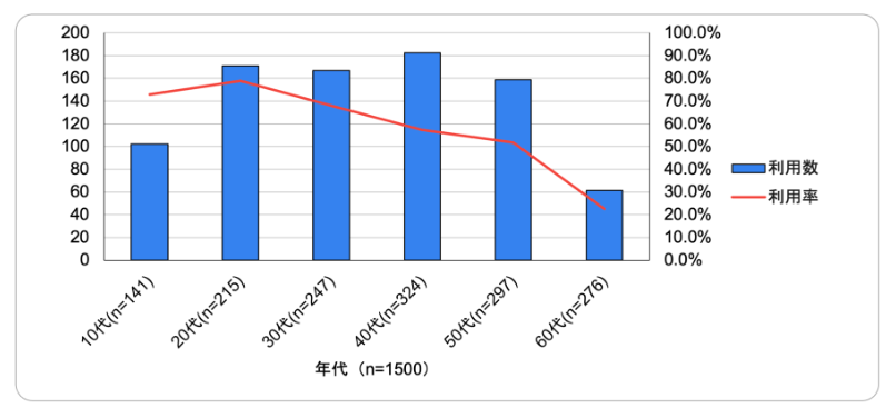 インスタグラムは、10代から20代で7割以上の利用率がありますが、30代から40代でも5割以上の利用率があることから、若年層だけでなく、幅広い年代に利用されているSNSであると言えます。