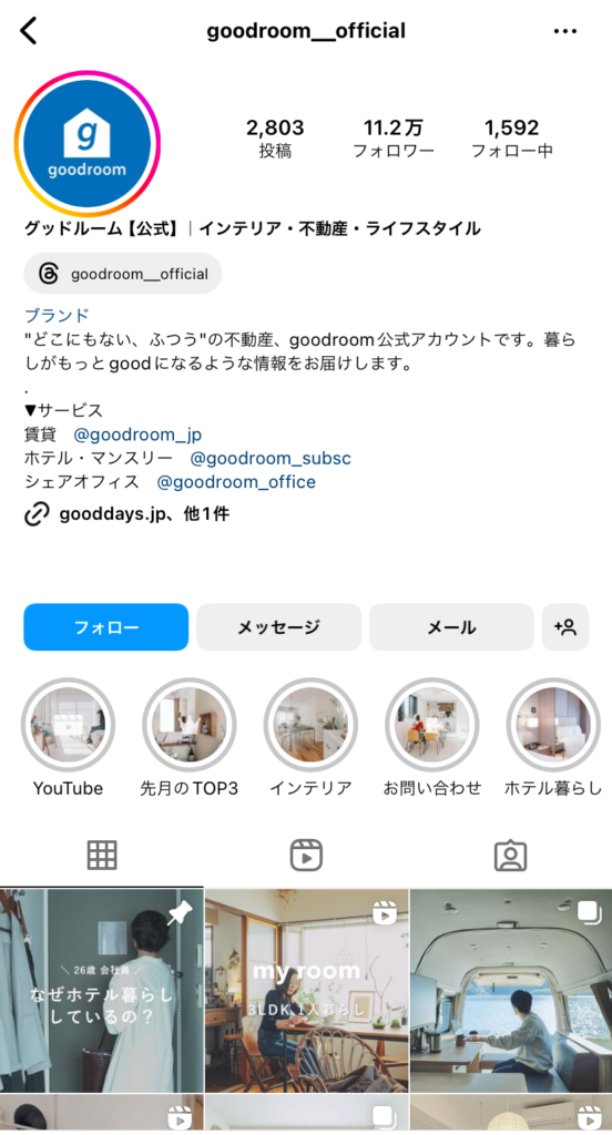 グッドルームは、リノベーション物件やデザイナーズ物件などの賃貸物件を専門に取り扱っています。プロフィールページ全体におしゃれな雰囲気が醸成されていますね。