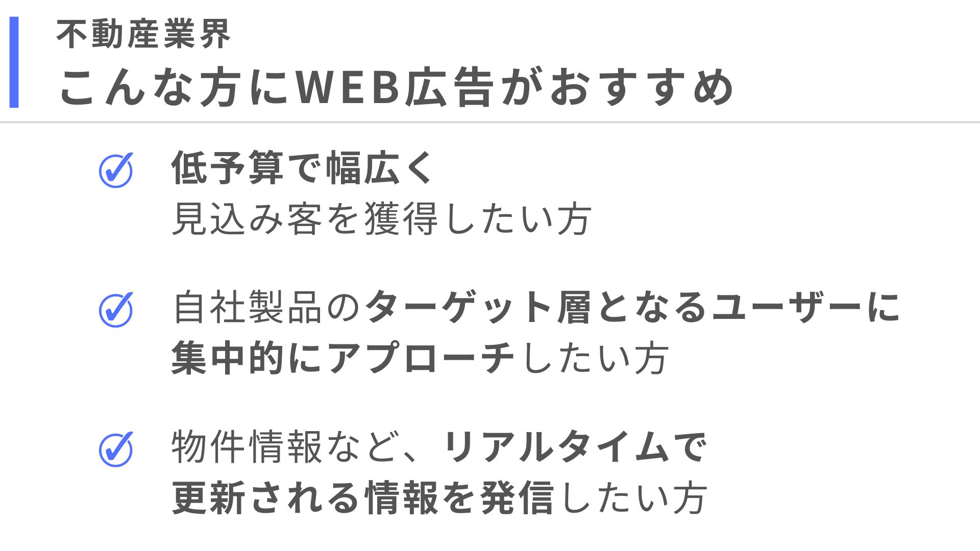 不動産事業者がバナー広告・ディスプレイ広告で効果を最大化するためのポイントは以下の3つです。