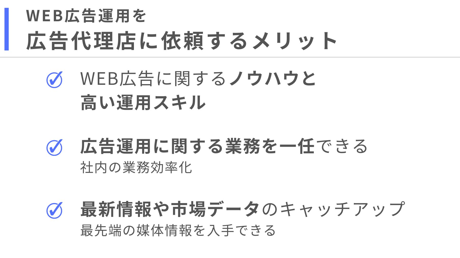ただし、代理店や担当者によって運用力には差があるため、必ずしもWEB広告代理店に任せればうまくいくわけではありません。