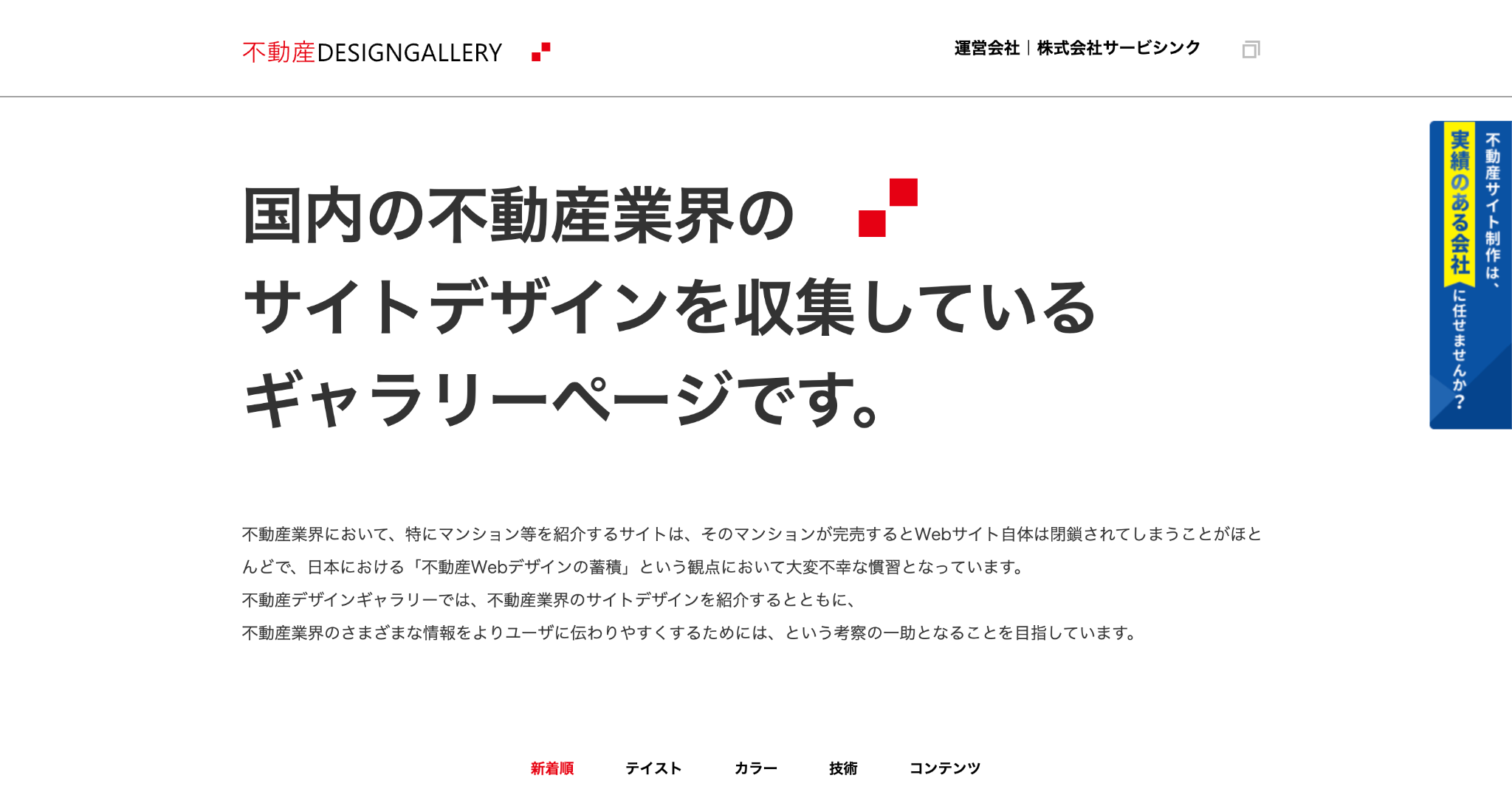 不動産DESIGNGALLERY は、国内の不動産業界に特化したサイトデザインを掲載するギャラリーサイトです。