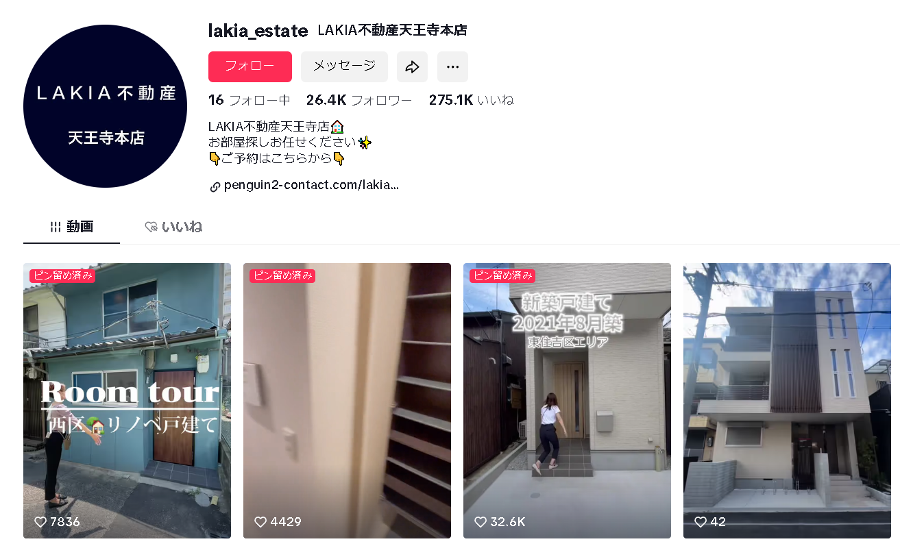 LAKIA不動産天王寺本店」は、大阪を拠点とする不動産会社のTikTokアカウントです。