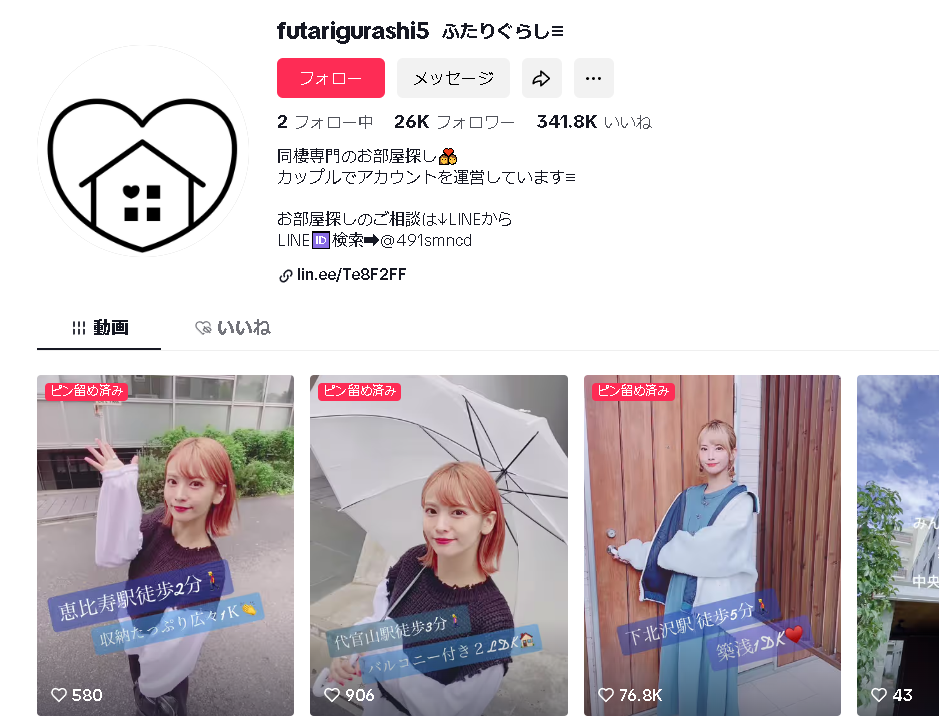 ふたりぐらし♡」は、フォロワー数2万6000人(20224年10月現在)の同棲向けの賃貸物件に特化した不動産アカウントです。