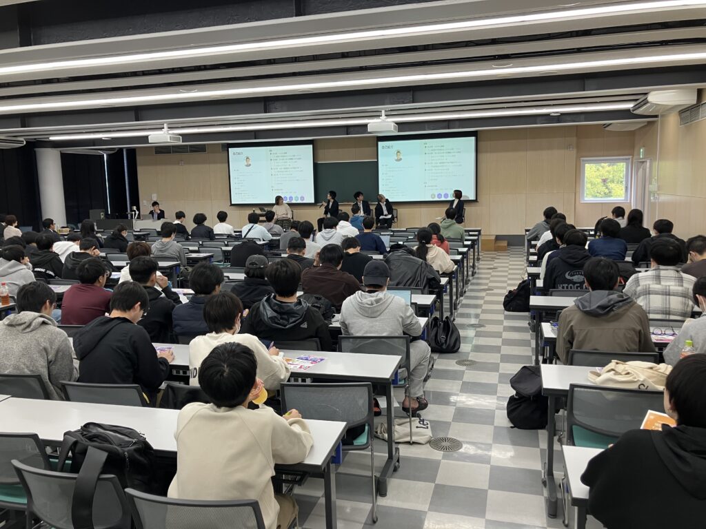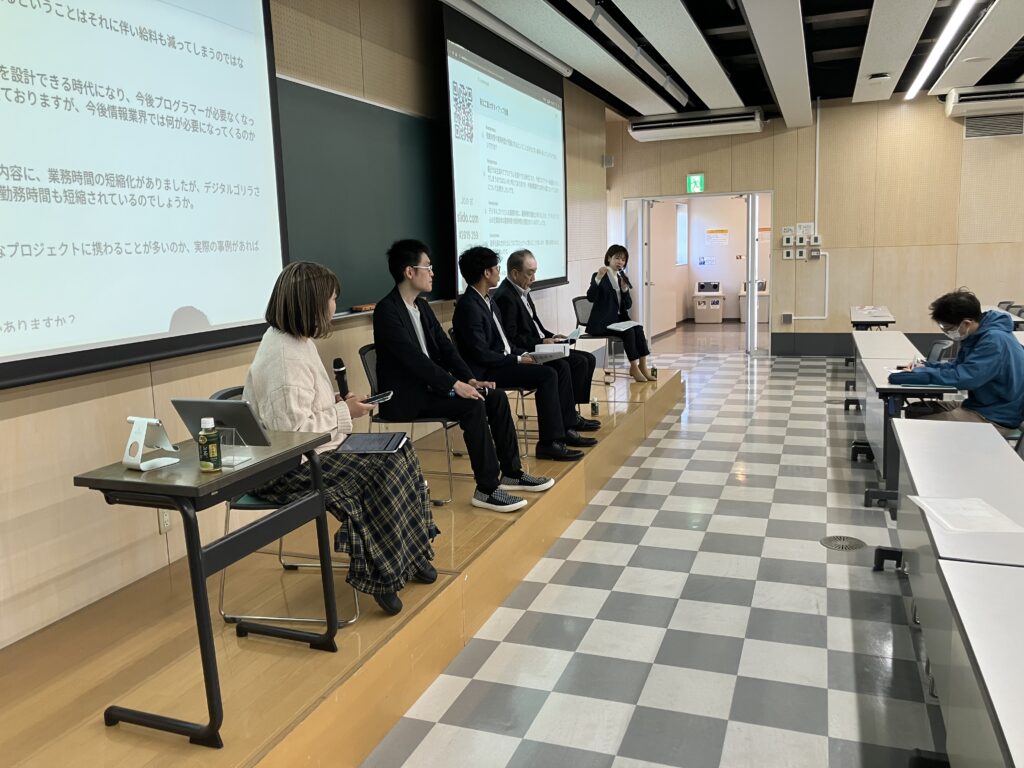 本授業は、仙台市経済局イノベーション企画課 成長産業係による取り組みの一環として実施され、仙台市内のIT企業と学生との接点を創出し、地域IT業界への就職を促進することを目的としています。授業の1コマを活用し、3社によるトークセッション形式で行われました。