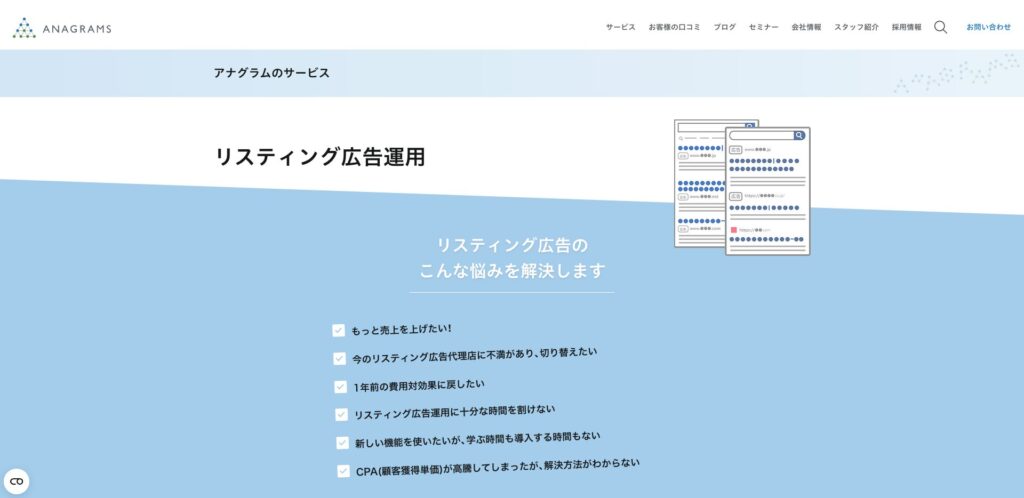 創業30年以上の歴史を持ち、BtoB領域や医療・教育・人材といった専門性の高い業界での支援に確かな実績を持っています。運用担当者は全員有資格者であり、ユーザーの特性や行動パターンを深く分析した精度の高いターゲティングに定評があります。月額30万円以下の広告費での運用にも対応しており、最低手数料は月額5万円(固定)で初期費用もかかりません。