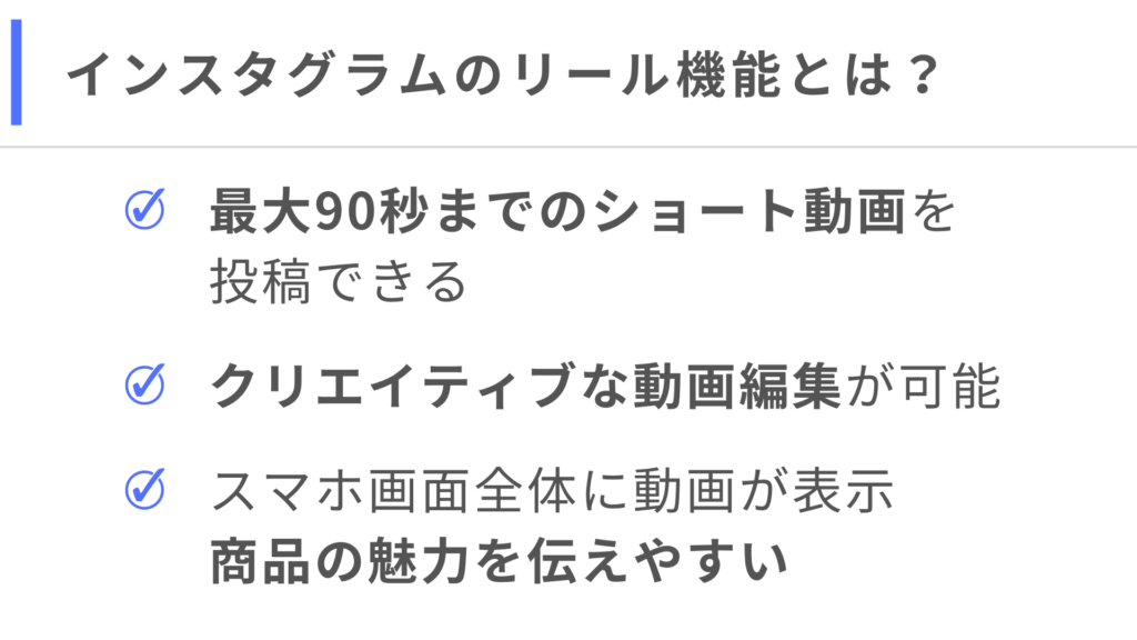 リールの活用方法をご紹介する前に、特徴や集客に有効な理由などを詳しく掘り下げてみましょう。
