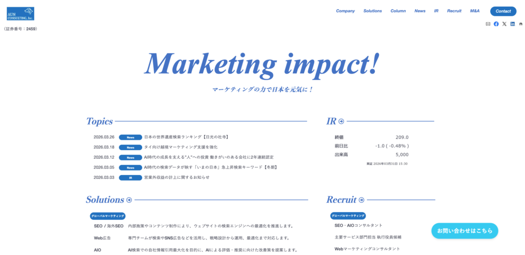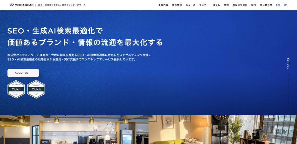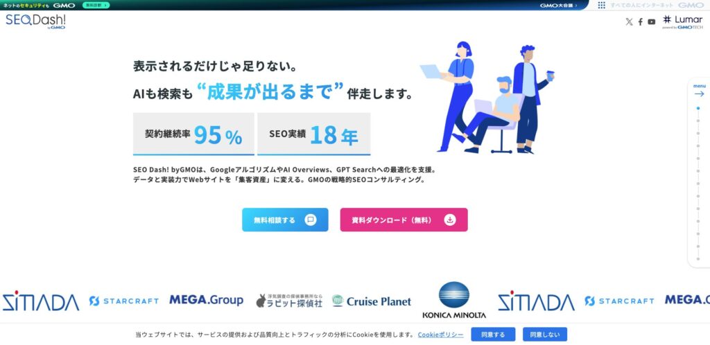 2002年からSEOに従事するベテランコンサルタントが在籍し、MEO対策に加えChatGPT検索対策など最新のAI検索対応を実施しています。テクニカルSEOを得意とし、英国Lumar社と提携した高レベルな分析ツールも保有。SEO・MEO・広告を組み合わせた総合的なWebマーケティング支援が可能です。