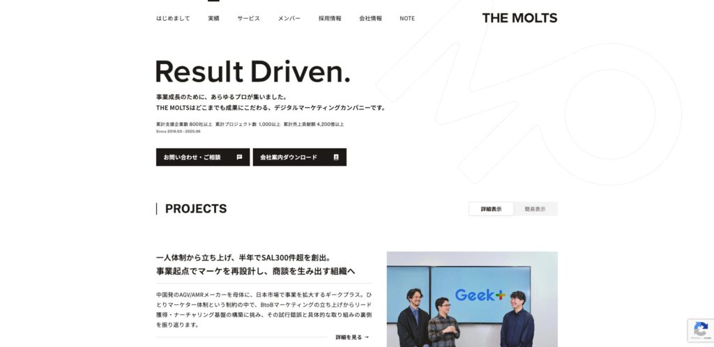 2023年設立の新鋭ながら、累計750以上のプロジェクト実績を持つデジタルマーケティングカンパニーです。オウンドメディア運用とコンテンツマーケティングに特化した専門集団で、大手上場企業からスタートアップまで幅広く支援。「Result Driven.」を掲げ、成果にこだわった戦略提案が持ち味です。