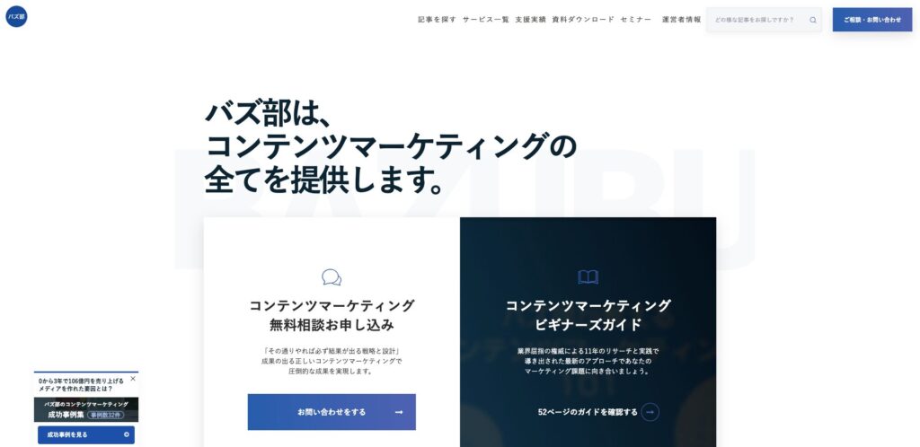 自社メディア「バズ部」を開設4ヶ月で100万PVに育て上げた実績を持つ、コンテンツマーケティングの先駆者的存在です。「ユーザー主義」を徹底し、SEOとユーザー体験の両立を重視した支援を提供。インハウス化(内製化)支援が特に強みで、外部依存から自走できる体制構築をサポートします。