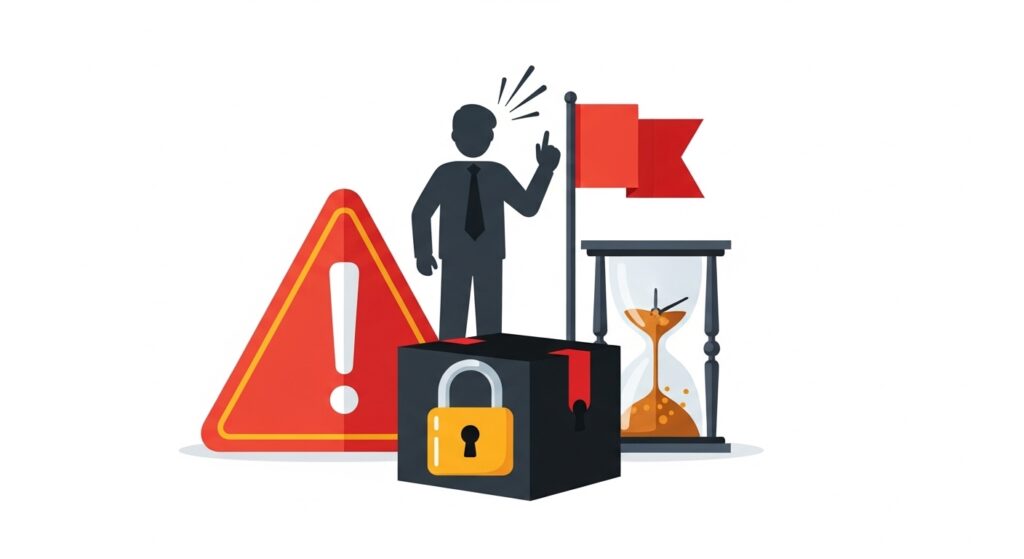 以下の3つの危険信号が出ている会社への依頼は避けてください。それぞれ詳しく解説していきます。