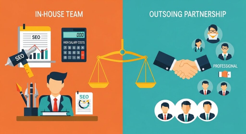 SEO専門会社に月額50万円で外注した場合、年間600万円の出費となりますが、自社で専任担当者を1名雇うのとほぼ同額のコスト感です。同じ金額を払うのであれば、プロの集団が持つ豊富な成功事例と、最新のアルゴリズム変動に対する迅速な対応スピードを買う方が確実といえるでしょう。
