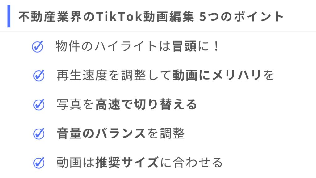 ここでは、短い時間で視聴者の目を惹き、物件情報が伝わるTikTok動画編集の5つのポイントをご紹介します。