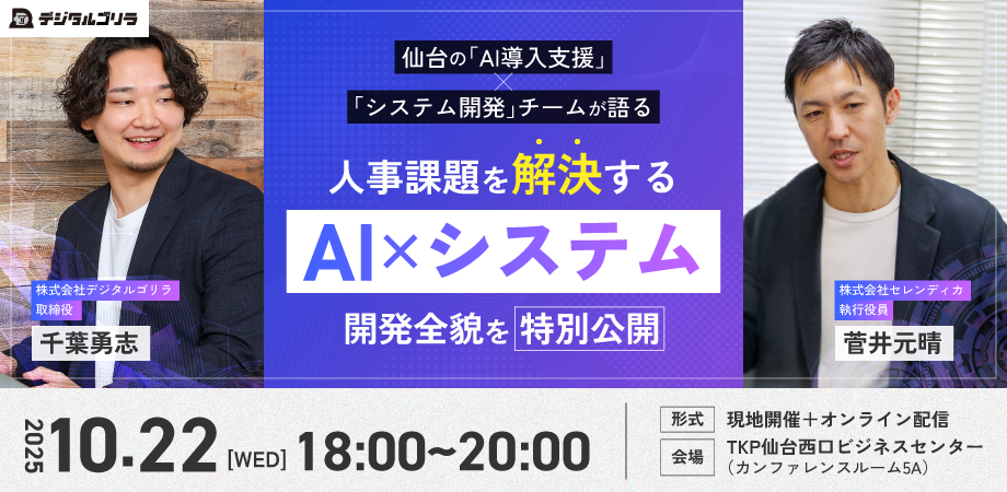株式会社デジタルゴリラと株式会社セレンディカは、「仙台の『AI導入支援』×『システム開発』チームが語る 人事課題を解決する『AI×システム』開発全貌を特別公開」を共同開催いたします。